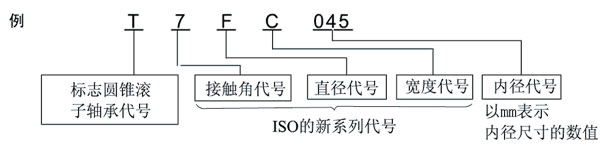 ISO355所規(guī)定的公制系列的圓錐滾子軸承中, 有不依據(jù)以往所使用的3xx尺寸系列的新尺寸。其中一部分記載于尺寸表。外圈寬度、外圈滾道的小端面直徑及接觸角與ISO的規(guī)定一致、內(nèi)圈組件和外圈均具有*際互換性。其型號(hào)不同于以往的公制系列,構(gòu)成如下。